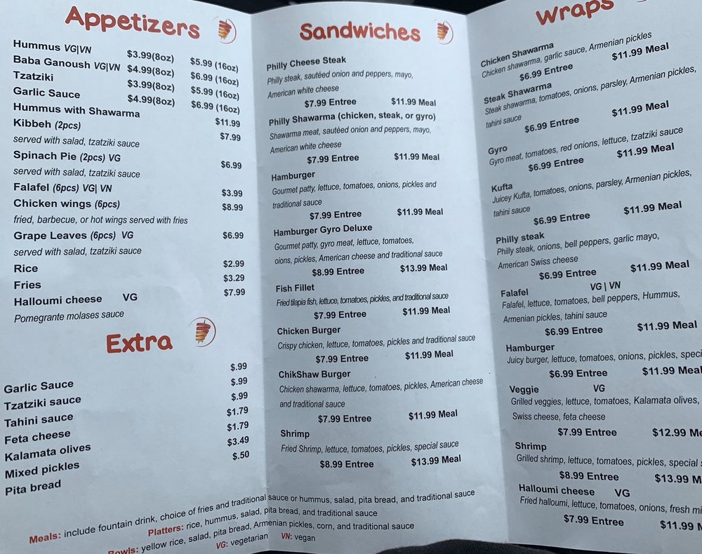 Chicken, shawarma, lettuce, tomatoes, pickles, American cheese and traditional sauce.